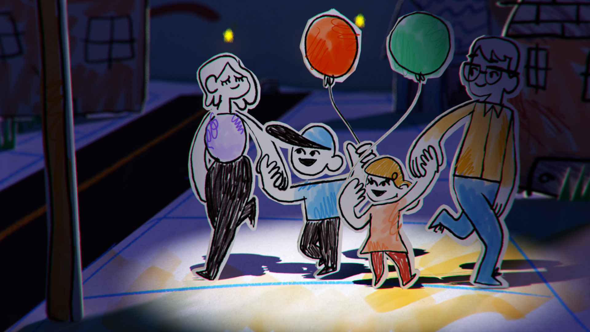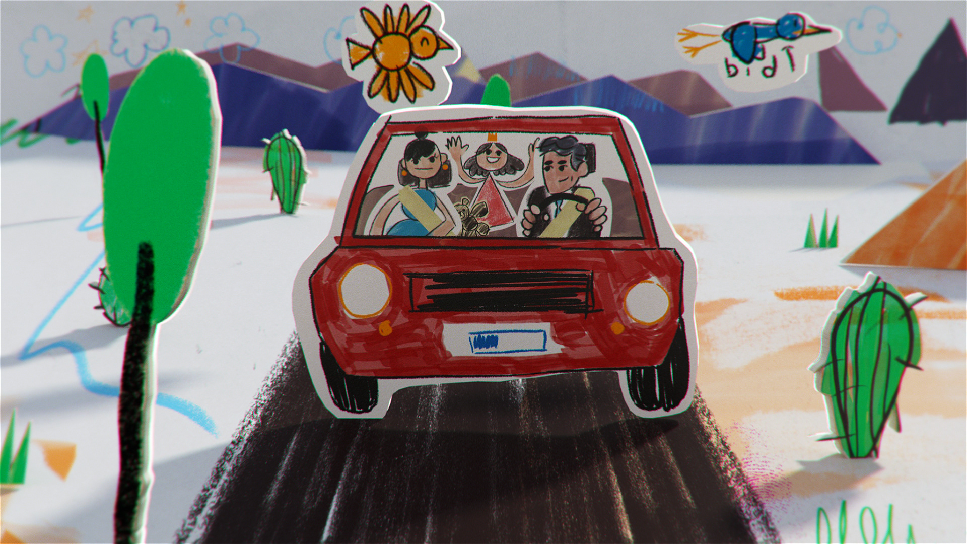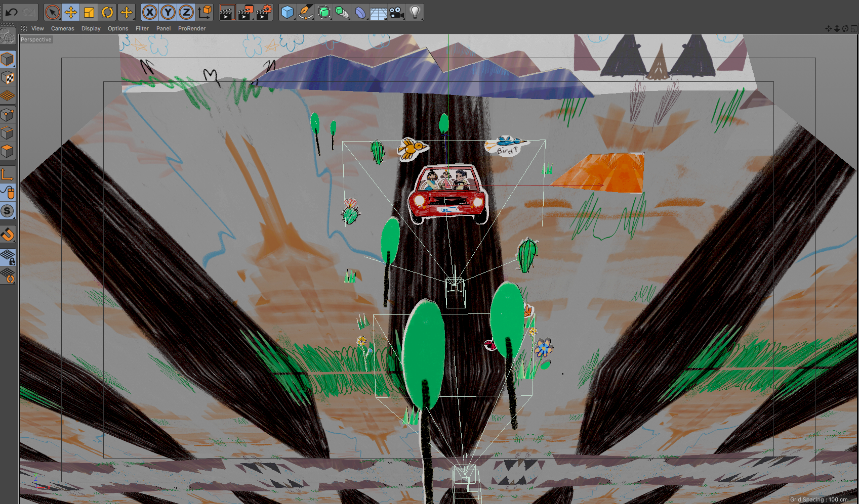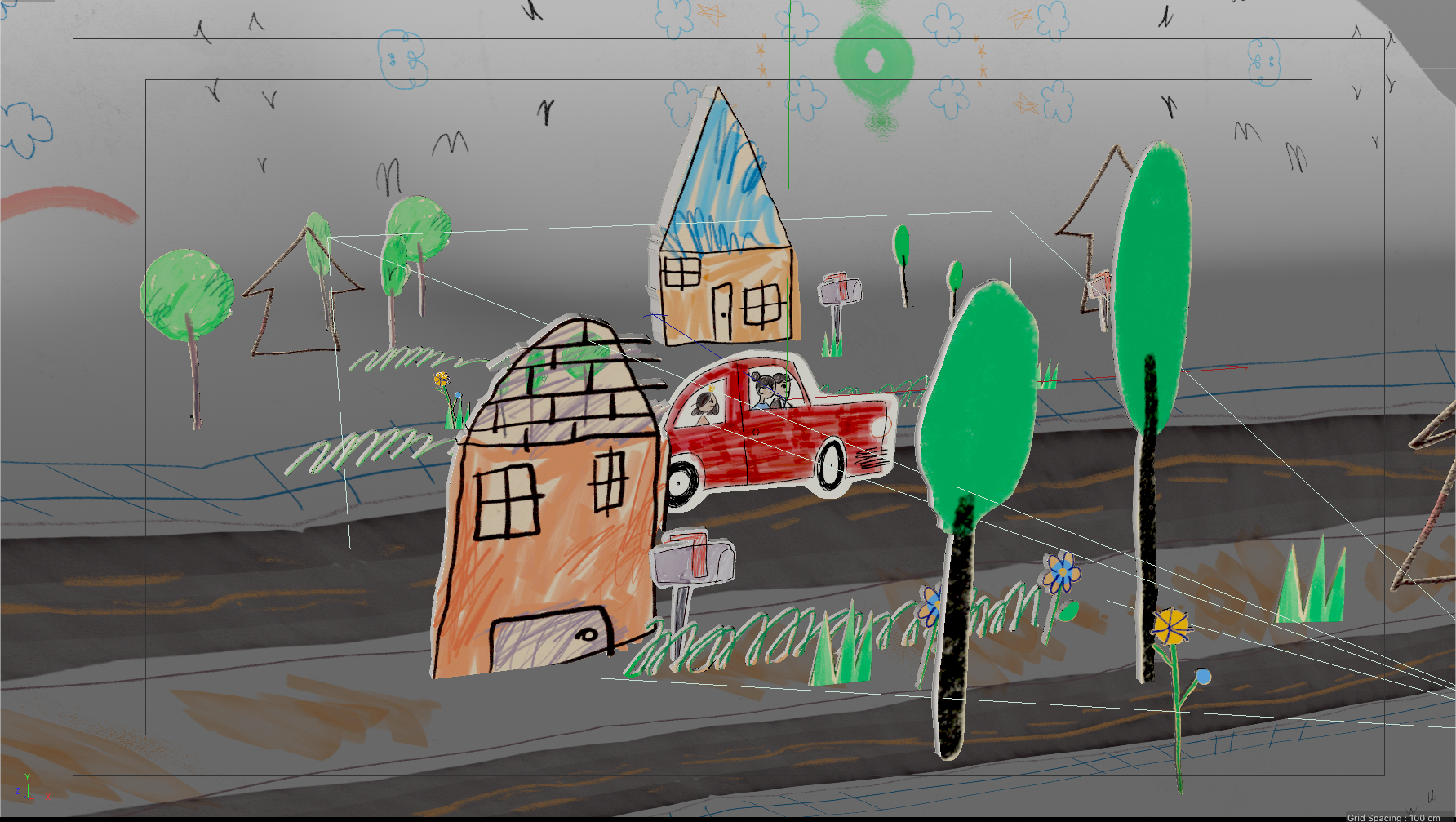 all the illustration where created and animated on 2D and later translate to 3D using a mix of projection mapping and animated paths on 3D to recreate a stop motion style all done using