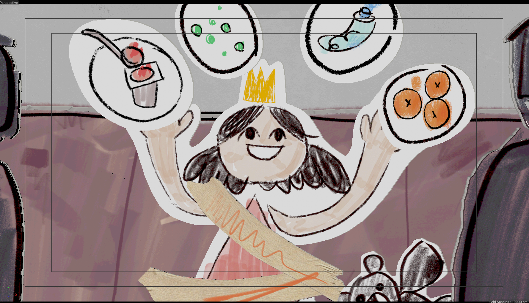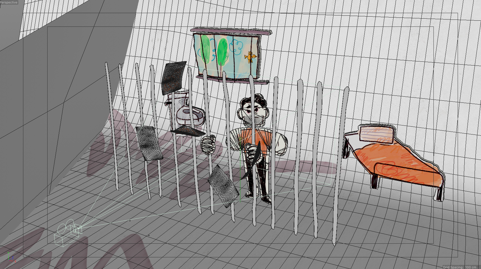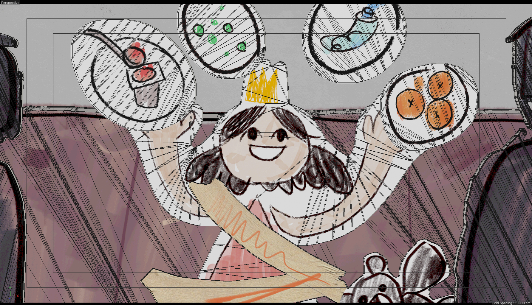 some captures to show the processes of translating all the 2d animations to 3d, illumination and camera setup